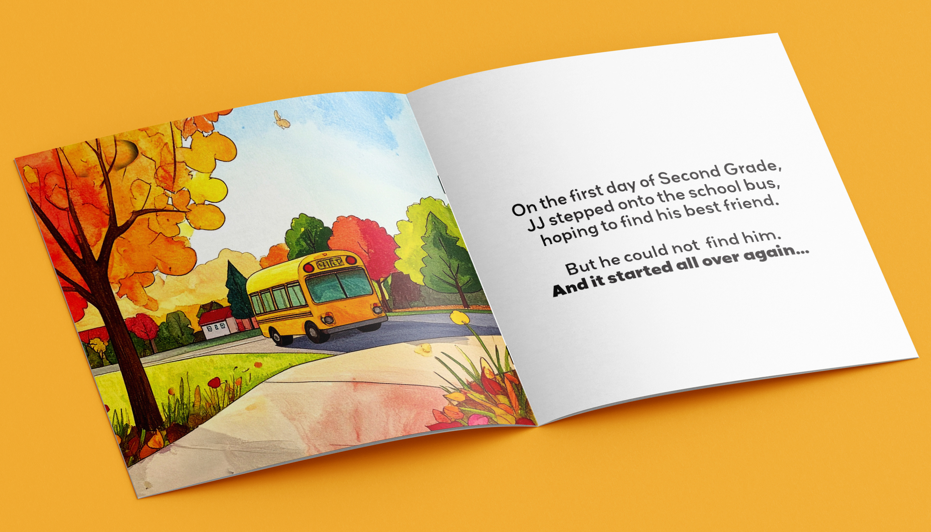 To maintain consistency across scenes, I developed a detailed AI prompt and applied it throughout the book, refining each illustration manually in Photoshop to ensure that the main character, JJ, looked and felt the same in every scene. Each element — from the warm fall palette on the first day to the bright summer tones on the last — was art directed to mirror the rhythm of a school year.
