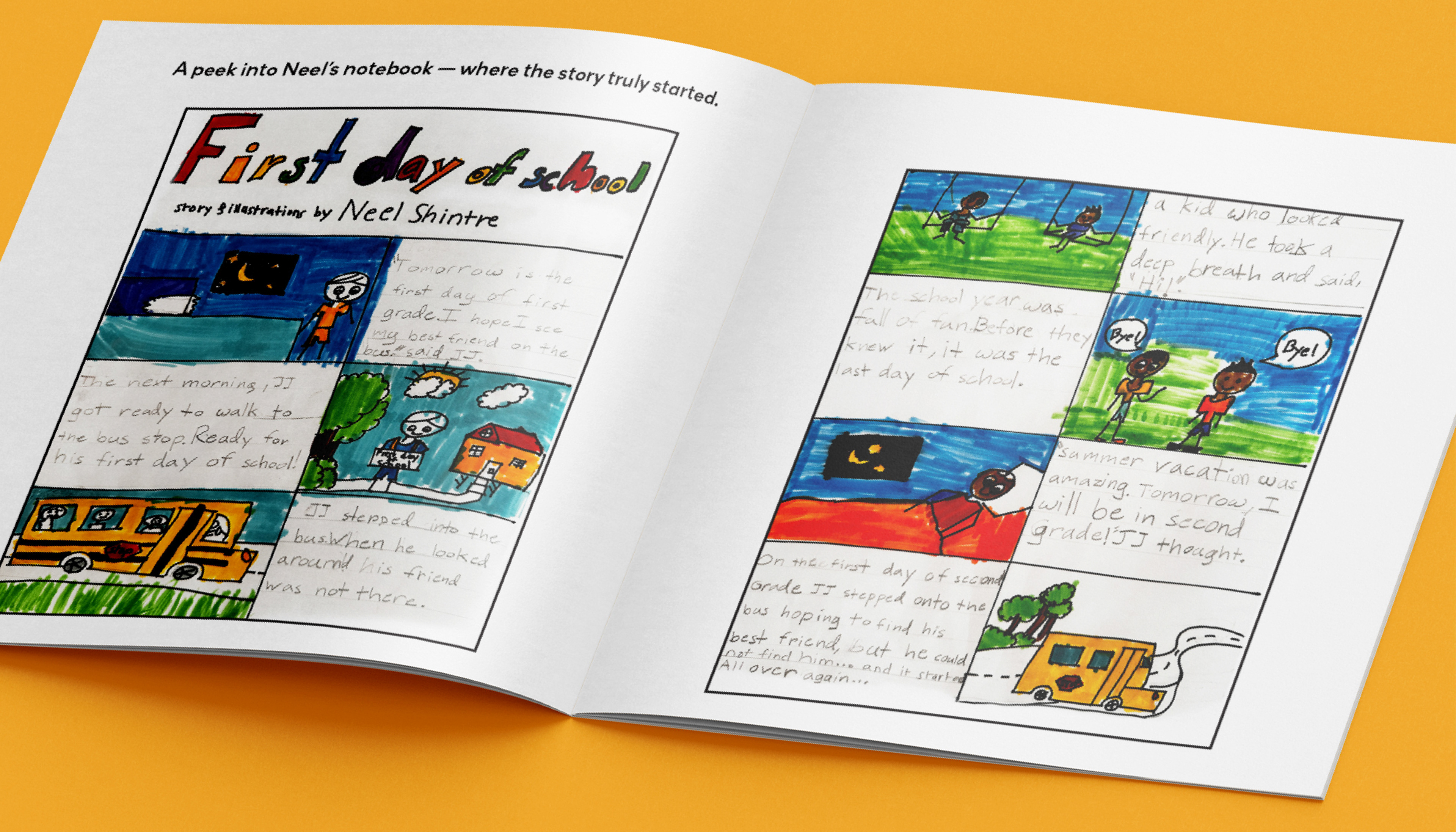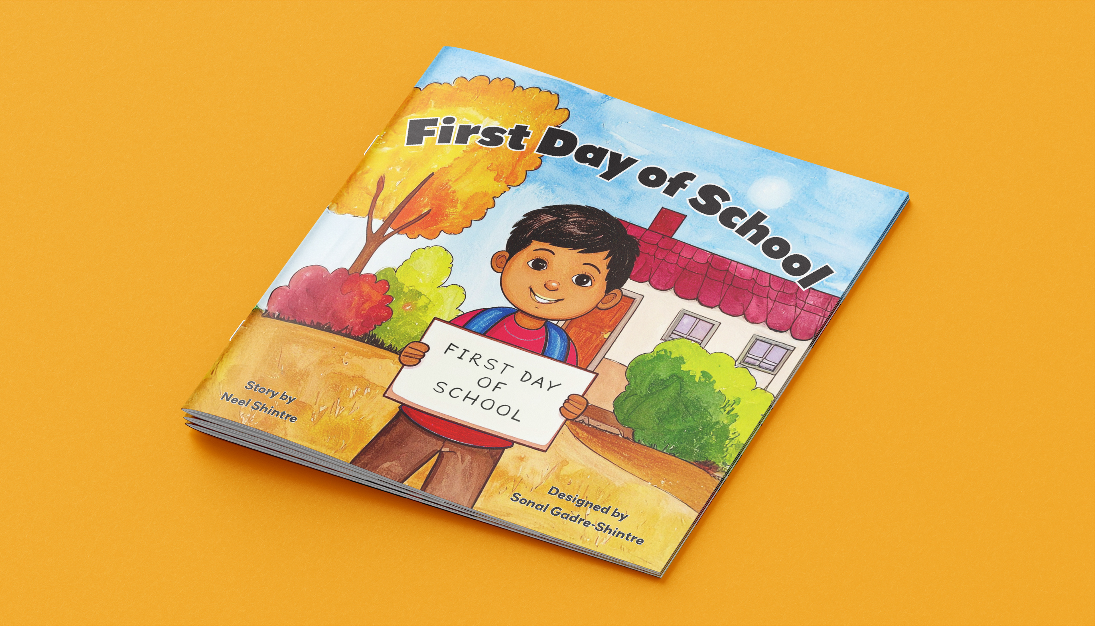 First Day of School began as a heartfelt story written and illustrated by my 6-year-old son, Neel, during his first week of first grade. His simple words and drawings captured the pure emotions of missing his best friend from kindergarten — and the courage it takes to start fresh. As a mother and a designer, I knew this story deserved to live beyond his notebook — as a picture book that could resonate with other children experiencing the same feelings.